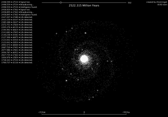 A relatively simple visualizer to see the Fermi Paradox in action, where species arise in star systems and broadcast signals until they are destroyed. If a species becomes intelligent while another is broadcasting, they will find each other. A dead species also sends out one last broadcast which can be spotted if another arises in time.